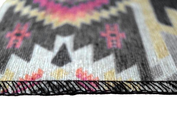 تم تصنيع السجادة من خامة بوليستر 100% التي تتميز بالنعومة والمتانة، مع قاعدة من القطن المنسوج والمطاط تمنحها ثباتًا قويًا على الأرضية وتمنع الانزلاق أثناء الاستخدام.