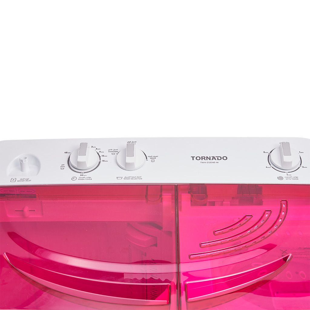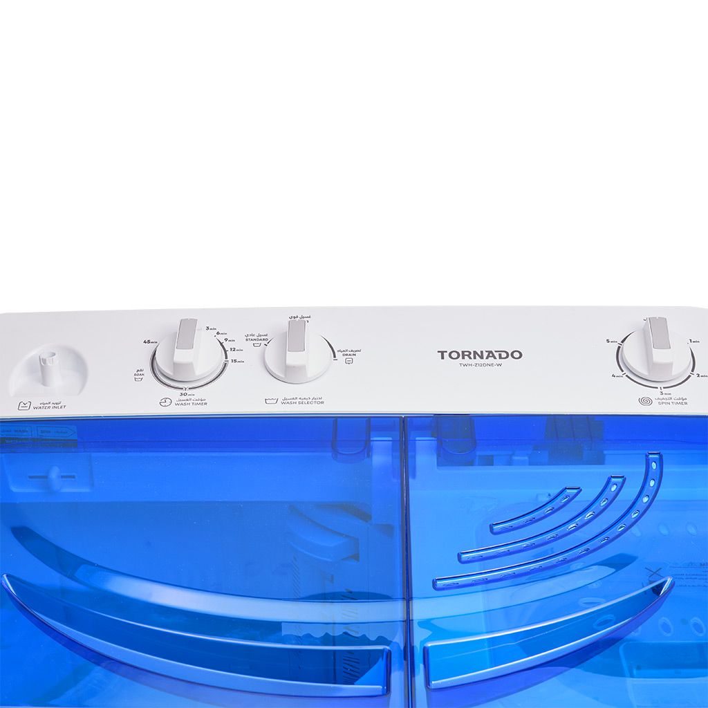 احصل الآن على غسالة ملابس تورنيدو نصف أوتوماتيك 12 كجم أبيض × أسود/أحمر/أزرق وتمتع بأداء ممتاز وسعة كبيرة تناسب جميع احتياجات الغسيل.