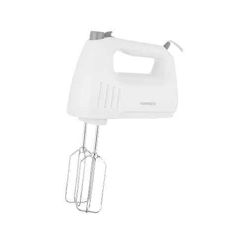 The Tornado 300W Egg Beater features a compact design in a stylish white finish and a durable, heat-resistant plastic body with comfortable handles for a secure grip. It also comes with two stainless steel beaters and two dough hooks for versatility in the kitchen.