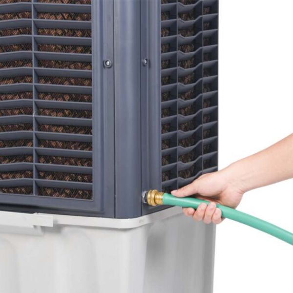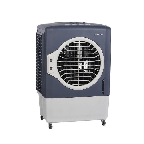 Featuring a sleek grey color and durable exterior body, the Tornado cooler is built with strong wheels for easy mobility. It supports dual water filling (manual or hose connection), and is equipped with an automatic refill valve for convenience.