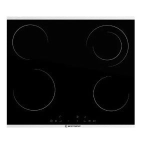 Ecomatic Vitro Ceramic 60cm Electric Hob Digital Touch 4 burners, including 1 large double burner 9 cooking levels Pause & Play function with memory Safety thermal shut-off system Child Lock Safety indicators Additional thermostat for energy savings Automatic shut-off timer for each burner Shock-resistant stainless steel decorative front and rear frame
